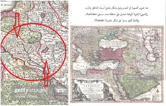 Dema ku li ser çavkaniyê zoom kirin, navên herêm û bajaran bi zelalî têne xuyang kirin, û wêneya ji nêz ve ve girêdayî herêmek bi navê / Kurdistan / dide, û bajarê wî yê herî mezin bi rengê paytext / Diarbekr / Çavkaniya wêneyê tête nîşankirin : (Wêne: Sepia Times / Koma Wêneyên Gerdûnî bi navgîniya Getty Images).