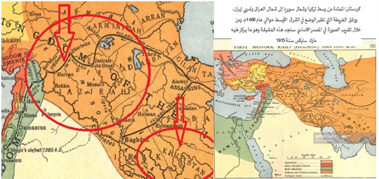 Di vê serdemê de, hebûna Kurd li Rojhilata Navîn li ser nexşeyê, îro di navbera Tirkiye û Sûriyê de, xuya dibe. Çavkaniya Nexşeyê: Atlasa Dîrokî ya William R. 19ivan di 1923 de